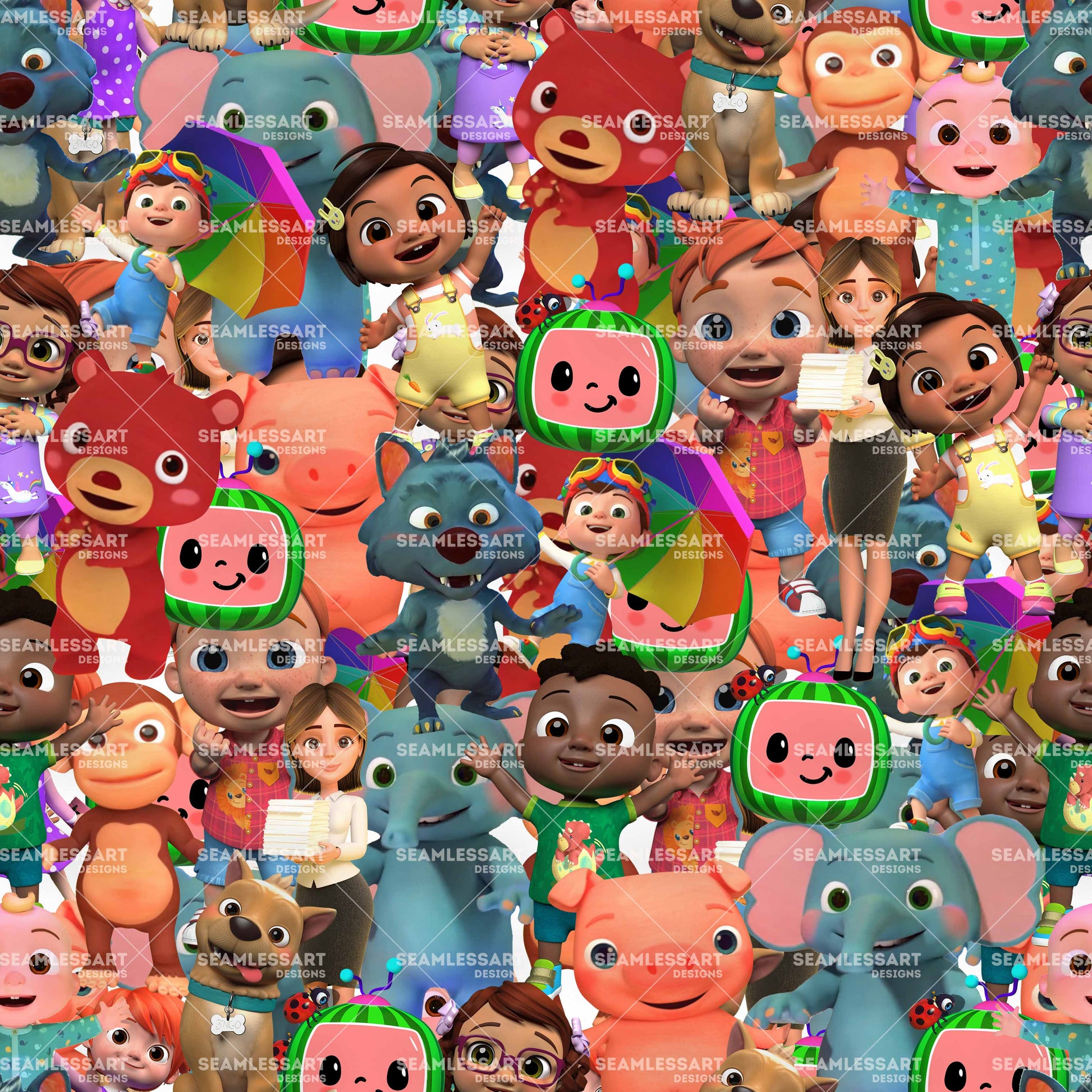 CoComelon Characters Collage Seamless Pattern – Kids Cartoon Digital Paper for Playroom Decor, Apparel Prints & Creative Merchandise Designs